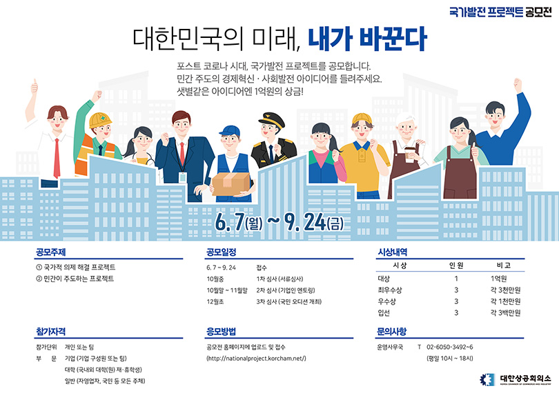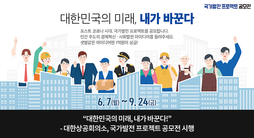 대한상공회의소가 6월 7일부터 국민 집단지성의 힘을 모으는 ‘국가발전 프로젝트 공모전(이하 공모전)’을 시작했다. 코로나19로 침체된 경제 상황을 국민의 힘으로 극복하고 국가를 발전시키기 위함이다.