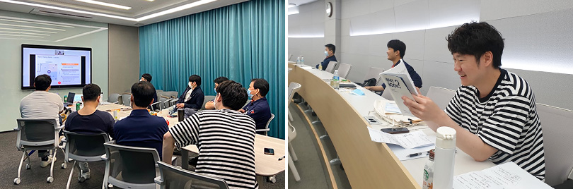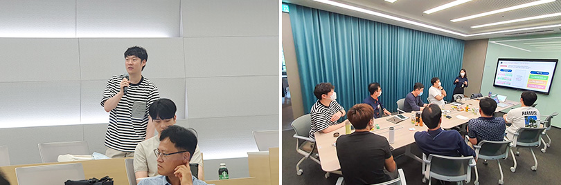▲ (좌측) ‘세대공감 클랜(Clan)’ 활동을 위해 모인 자리에서 김준연 사원이 자기소개를 하고 있다. / (우측) ‘세대공감 클랜(Clan)’ 활동 중 세대공감 정책을 만들기 위해 논의하고 있다.