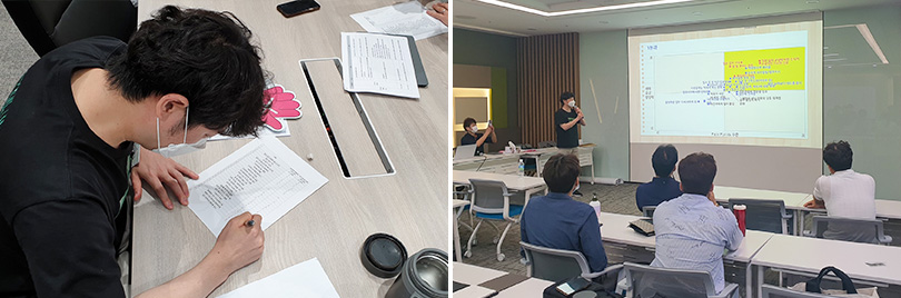 ▲ (좌측) ‘세대공감 클랜(Clan)’ 활동을 위해 클랜원들이 워크샵 조별 과제 중이다. / (우측) 김준연 사원이 첫 워크샵에서 꼰대지수를 평가하고 있다.