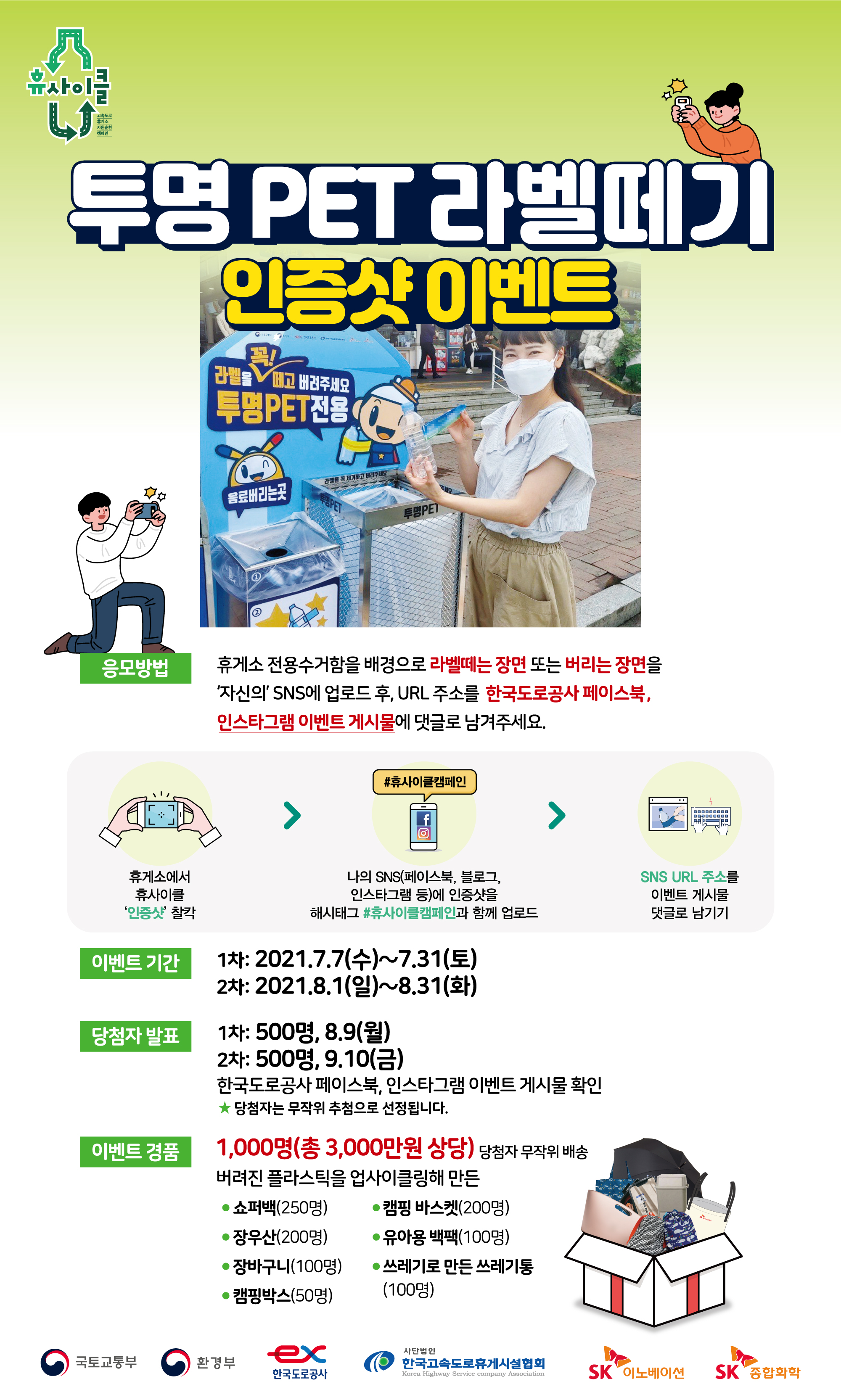 SK이노베이션 등 협의체는 ‘휴(休)-사이클’ 캠페인의 첫 활동으로, 전국 고속도로 휴게소 이용객들을 대상으로 하는 ‘투명페트 라벨떼기 인증샷’ 캠페인을 개시한다. 캠페인 기간은 ▲(1차) 7월 7일(수)부터 7월 31일(토), ▲(2차) 8월 1일(일)부터 8월 31일(화) 까지다.