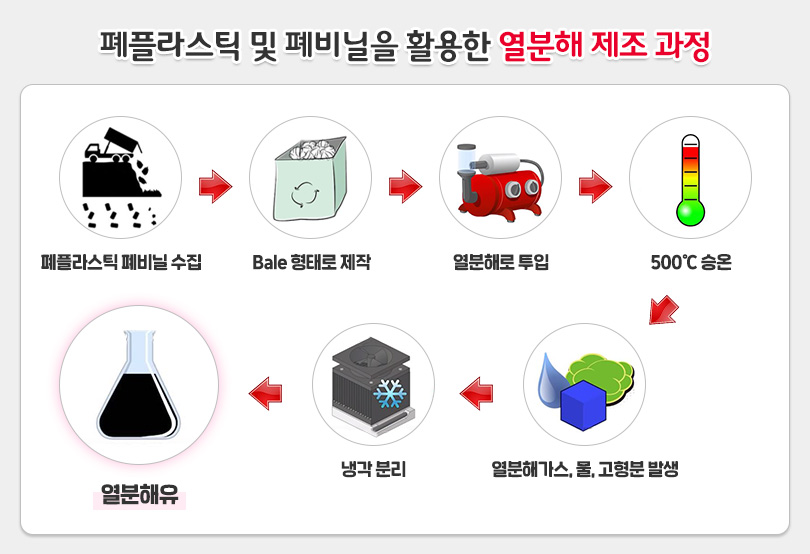 이 기술에 대해 간략히 소개하면, 수거/선별 업체를 통해 회수된 폐플라스틱은 무산소 조건 및 고온(약 300~500℃)에서 고분자 물질을 작은 분자로 분해하는 열분해 과정을 거치고 이후 분리/냉각 과정을 거쳐 ‘열분해유’를 생산하게 된다. 이렇게 만들어진 열분해유는 원유와 유사한 성상을 가지고 있기 때문에 도시 유전으로 표현하고는 한다. 하지만 원료 내 여러 종류의 플라스틱이 혼합되어 있는(Mixed Plastic) 특성 및 사용 과정에서 발생하는 잔재 오염물로 인해 원유와는 다른 다양한 불순물(염소, 황, 질소, 산소, 불포화 탄화수소 등)이 열분해유에 포함되어 있다.