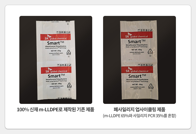 기존 포대는 100% 신재 m-LLDPE(5)로만 만들어졌지만, 향후 적용될 업사이클링 포대는 m-LLDPE 65%와 사일리지 PCR 35%를 혼합해 기존 제품 대비 약 25%의 이산화탄소 감축 효과가 있다. 물성적인 측면에서도 신재와 차이가 없어 어떠한 물류 환경에서도 유통이 가능하다.
