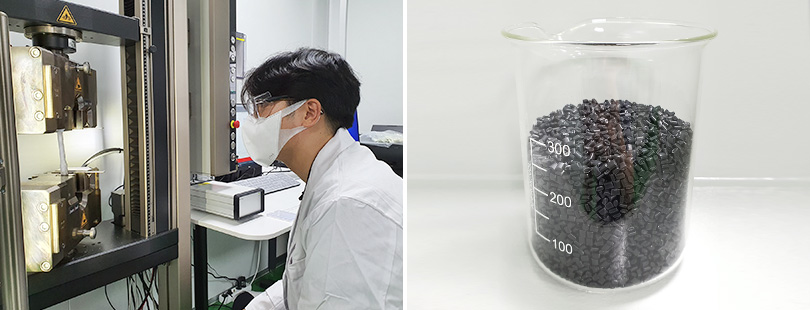 ▲ (좌) SK종합화학 구성원이 R-PP의 품질을 높이기 위한 실험을 진행하고 있다. / (우) SK종합화학이 개발한 R-PP 소재 샘플