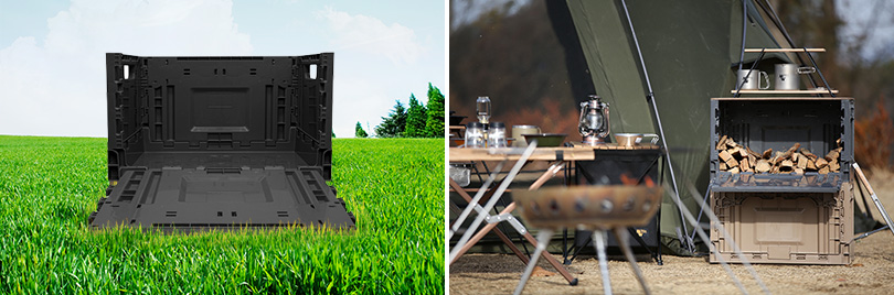 ▲(좌) SK종합화학의 R-PP를 활용해 제작되는 ‘미니멀웍스’의 업사이클링 제품 ‘폴딩박스 에코’ / (우) 캠핑장에서 장작 보관용으로 쓰이고 있는 ‘폴딩박스 에코’
