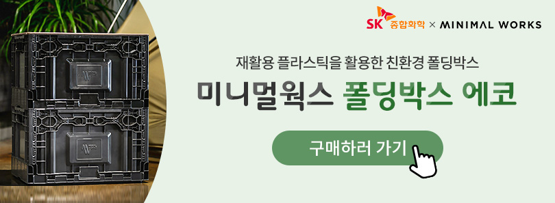 플라스틱 재활용 생태계 조성을 선도하는 SK종합화학의 기술력과 미니멀웍스가 만나 탄생한 ‘폴딩박스 에코’는 아래 배너에서 확인할 수 있다. 환경을 생각하는 캠핑족이라면 재활용 플라스틱으로 만든 ‘폴딩박스 에코’를 사용해 보자.