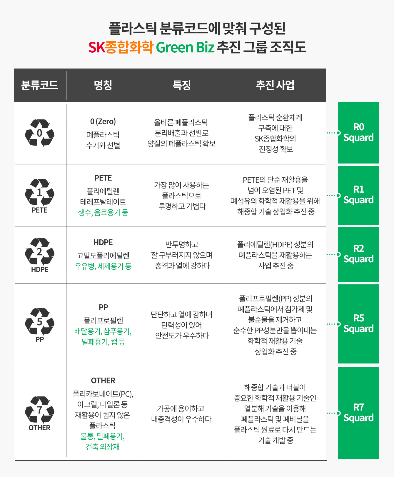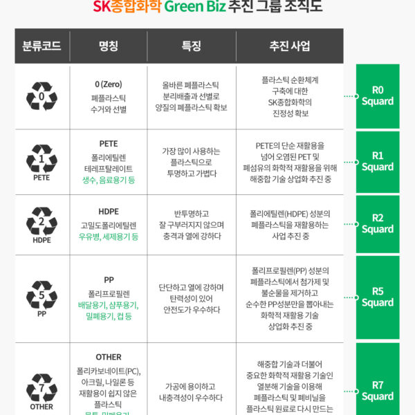 올해 초 SK종합화학은 플라스틱 원재료 생산 물량의 100%를 재활용한다는 목표로 순환경제 모델을 개발하기 위해 Green Biz 추진 그룹을 신설했다. Green Biz 추진 그룹은 플라스틱 분류 코드에 착안해 폐플라스틱을 성분별로 세분화한 코드를 만들고, 각 코드 넘버에 해당하는 프로젝트 팀을 구성해 폐플라스틱 재활용 사업을 추진하고 있다.