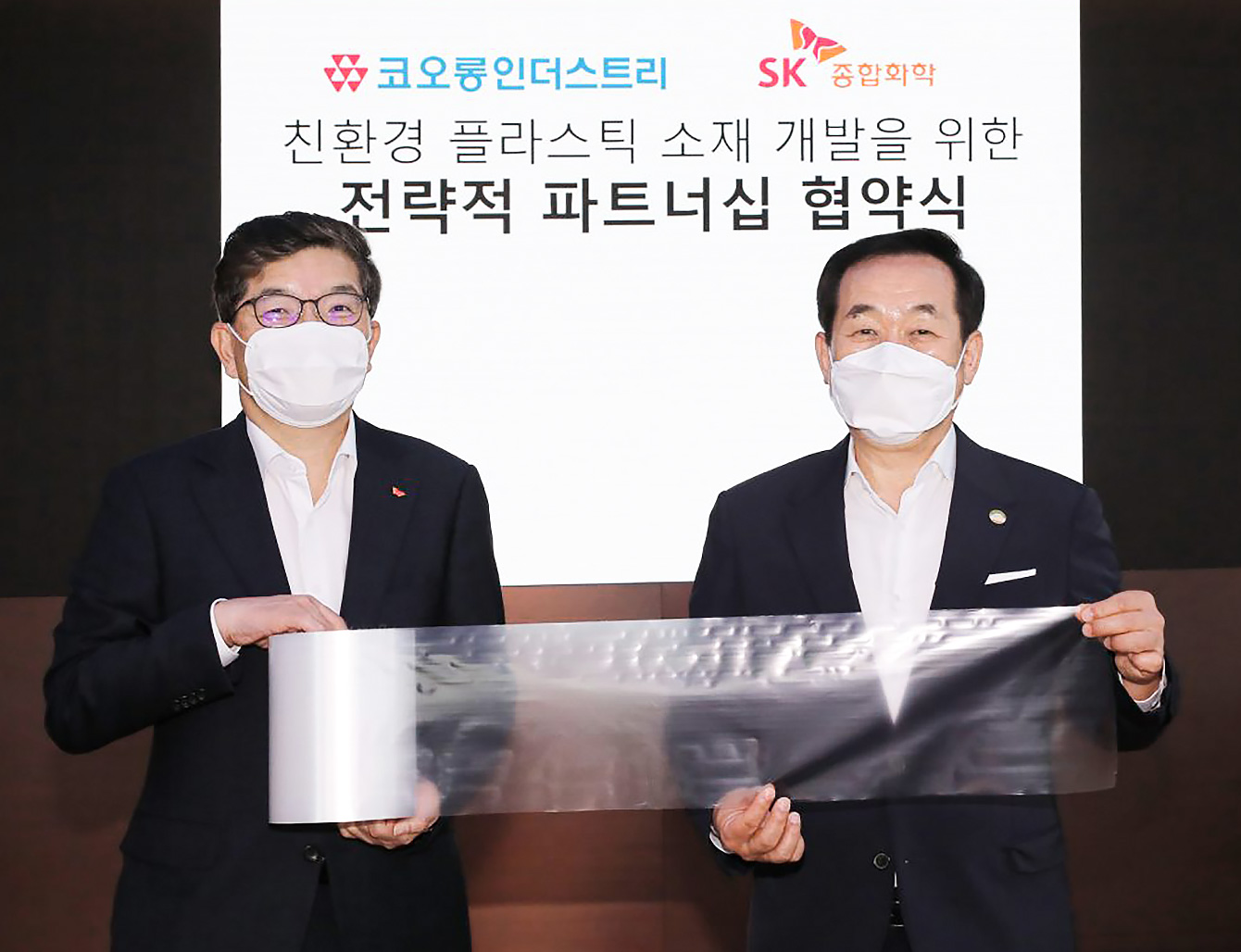 ▲ SK종합화학 나경수 사장과 코오롱인더스트리 장희구 대표이사가 파트너십 협약식에서 양사가 공동 개발한 PBAT 샘플을 들어보이고 있다.