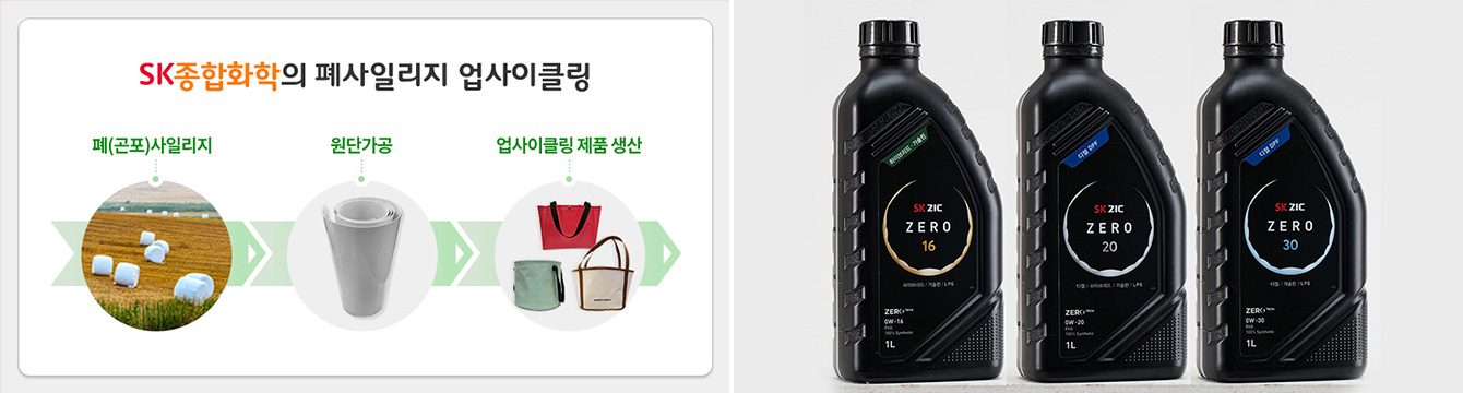 ▲ (좌측) SK종합화학의 폐사일리지 업사이클링 과정 / (우측) 친환경 용기를 적용한 SK루브리컨츠의 엔진오일 SK ZIC ZERO