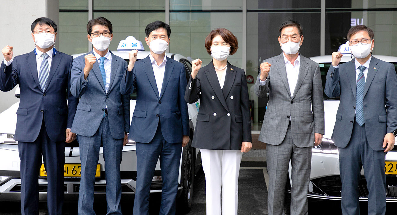 ▲ 8월 24일, 서울 양재동 소재 더케이호텔에서 열린 ‘무공해택시 보급 확대 위한 MOU’ 체결식에 참석한 행사 관계자들이 기념사진을 촬영하고 있다. (왼쪽에서 세 번째부터 유연식 서울시 기후환경본부장, 한정애 환경부 장관, 오른쪽에서 첫 번째가 강동수 SK에너지 Solution & Platform추진단장)