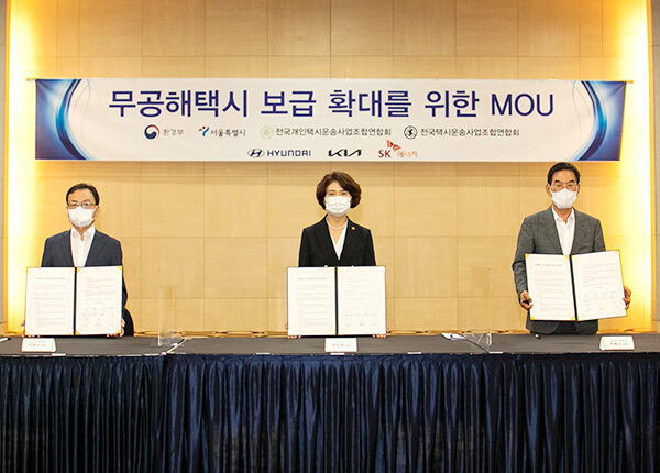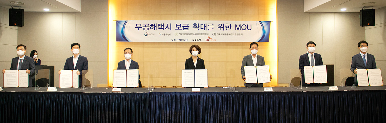 환경부는 2025년까지 무공해택시(전기·수소택시) 누적 10만 대를 보급하기 위해 서울특별시, 개인택시연합회, 법인택시연합회, 현대자동차·기아자동차, SK에너지와 8월 24일, 서울 양재동에 위치한 더케이호텔에서 업무협약(MOU)을 체결했다.