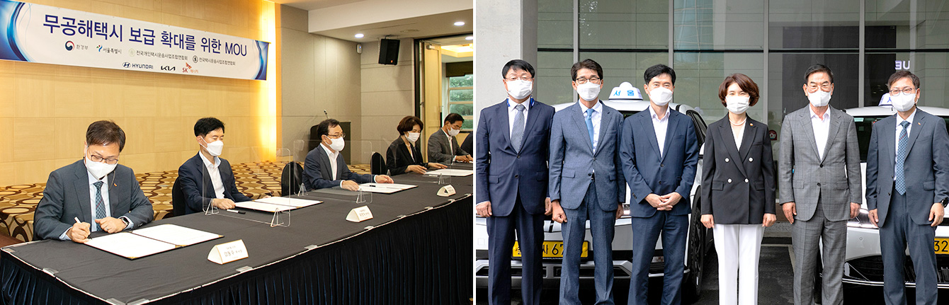 ▲ (좌) 8월 24일, 서울 양재동 소재 더케이호텔에서 열린 ‘무공해택시 보급 확대 위한 MOU’ 체결식에 참석한 강동수 SK에너지 Solution & Platform추진단장(왼쪽에서 첫 번째) 등 행사 관계자가 사인을 하고 있다. / (우) ‘무공해택시 보급 확대 위한 MOU’ 체결식에 참석한 행사 관계자들이 기념사진을 촬영하고 있다. (왼쪽에서 세 번째부터 유연식 서울시 기후환경본부장, 한정애 환경부 장관, 오른쪽에서 첫 번째가 강동수 SK에너지 Solution & Platform추진단장)