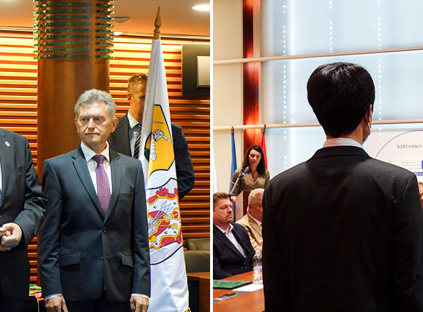 ▲ (좌) 9월 10일(현지시간), 터터바녀 소재 코마롬-에스테르곰州 관청에서 열린 행사에서 ‘포포비츠 쥬르그’ 코마롬-에스테르곰 주지사가 인사말을 전하고 있다. / (우) SK이노베이션 헝가리 법인이 9월 10일(현지 시간), 코마롬-에스테르곰州로부터 지역사회에 기여한 공로를 인정받아 ‘州 대표 대기업상’을 수상했다. (왼쪽에서 첫 번째가 SK battery Hungary 한상규 법인장)