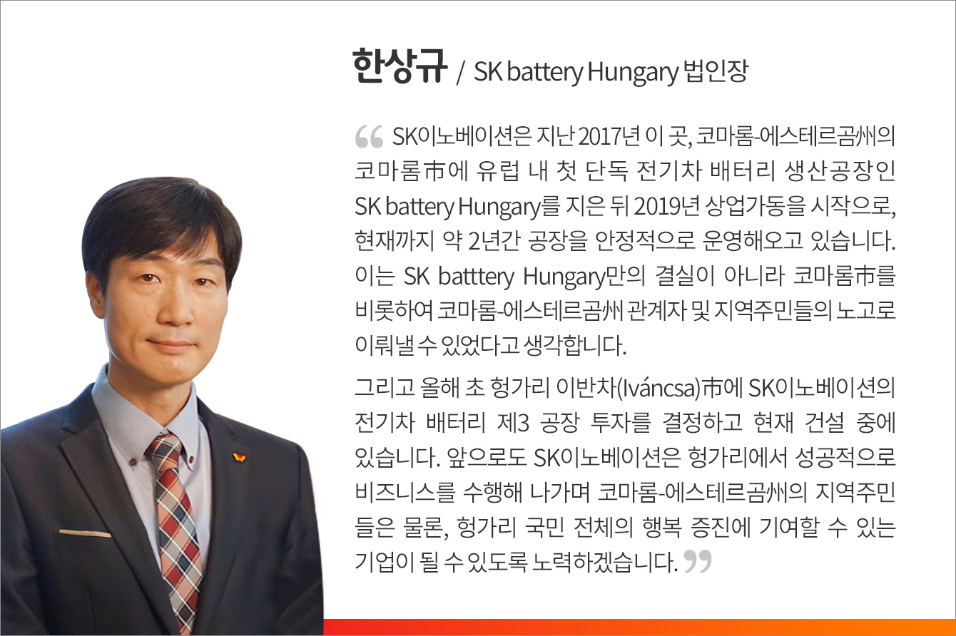 SK이노베이션 헝가리 법인(SK battery Hungary, 이하 SKBH)은 9월 10일(현지 시간), 지역사회에 기여한 공로를 인정받아 사업장이 위치한 코마롬-에스테르곰(Komárom-Esztergom)州로부터 ‘주 대표 대기업상’을 수상했다. 터터바녀(Tatabánya) 소재 코마롬-에스테르곰州 관청에서 열린 이날 행사에는 포포비츠 쥬르그(Popovics György) 코마롬-에스테르곰 주지사, 독토르 뷸내르 팔(Dr. Völner Pál) 법무부 차관, 독토르 컨츠 처버(Dr. Kancz Csaba) 헝가리 정부위원, SKBH 한상규 법인장 등 행사 관계자가 참석했다.