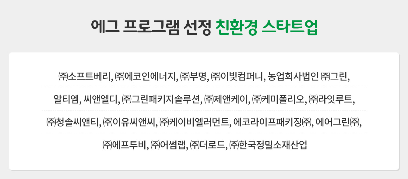 중기부와 창진원이 주관하는 ‘창업도약패키지 대기업 협업 프로그램’의 일환인 ‘에그’는 ‘에’스케이 이노베이션(SK이노베이션)과 ‘그’린벤처가 함께 만들어간다는 뜻을 가지고 있다. 이 프로그램은 친환경 스타트업이 그린 유니콘으로 성장할 수 있도록 지원하면서 친환경 스타트업 생태계를 조성하고 이를 통해 우리 사회의 지속가능성을 높이는 것을 목표로 하고 있다.