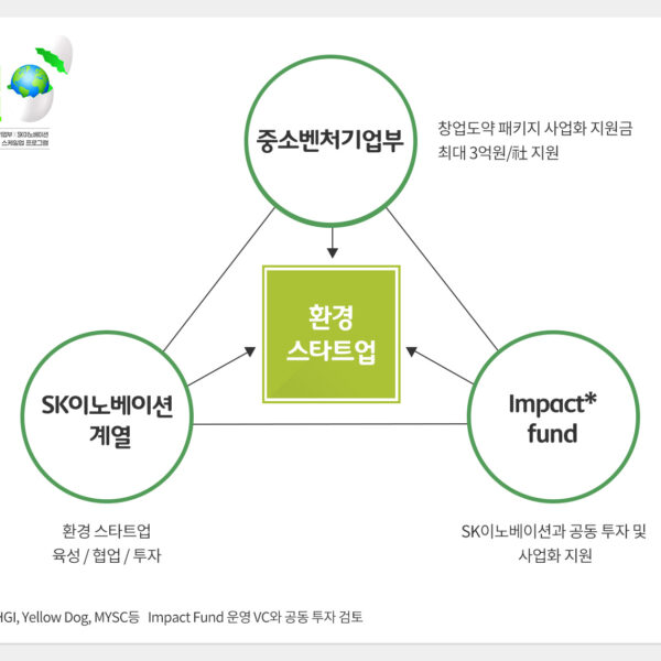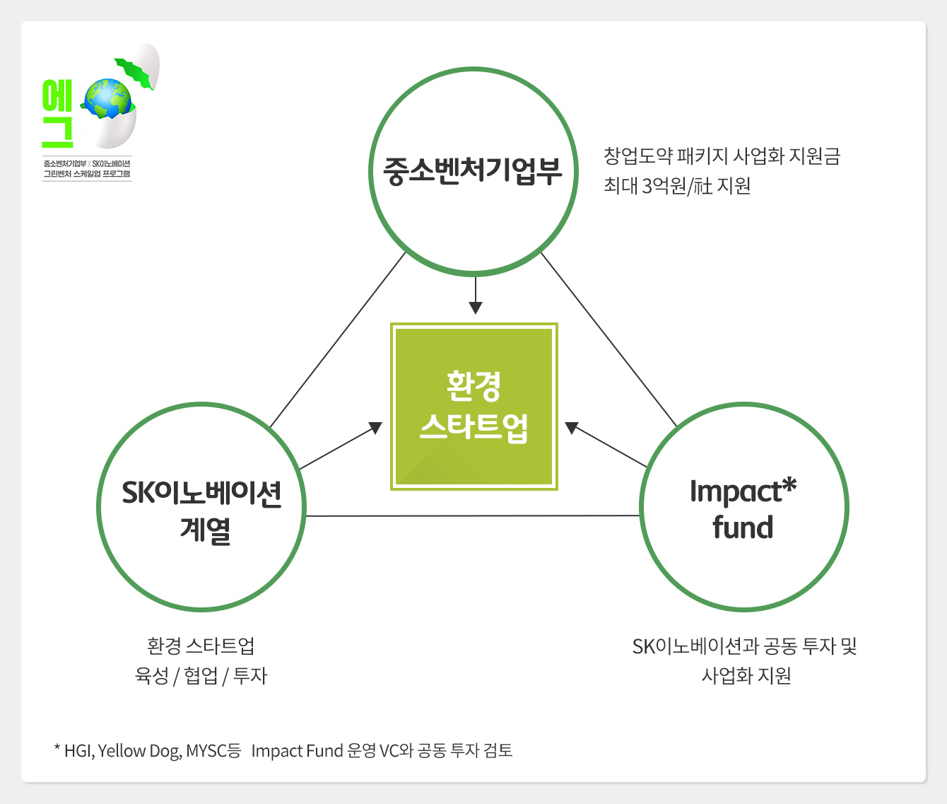 SK이노베이션이 중소벤처기업부(이하 중기부)와 창업진흥원(이하 창진원)과 함께 친환경 스타트업 생태계를 조성하는 프로그램 ‘에그’를 추진한다. ‘에그’는 국내최초로 정부 기관, 대기업 및 사회혁신을 위해 투자하는 임팩트 펀드(Impact Fund) 간의 협업을 통해 친환경 스타트업을 육성/지원하는 프로그램이며, 9월 13일에 ‘에그’의 시작을 알리는 발대식이 개최됐다.