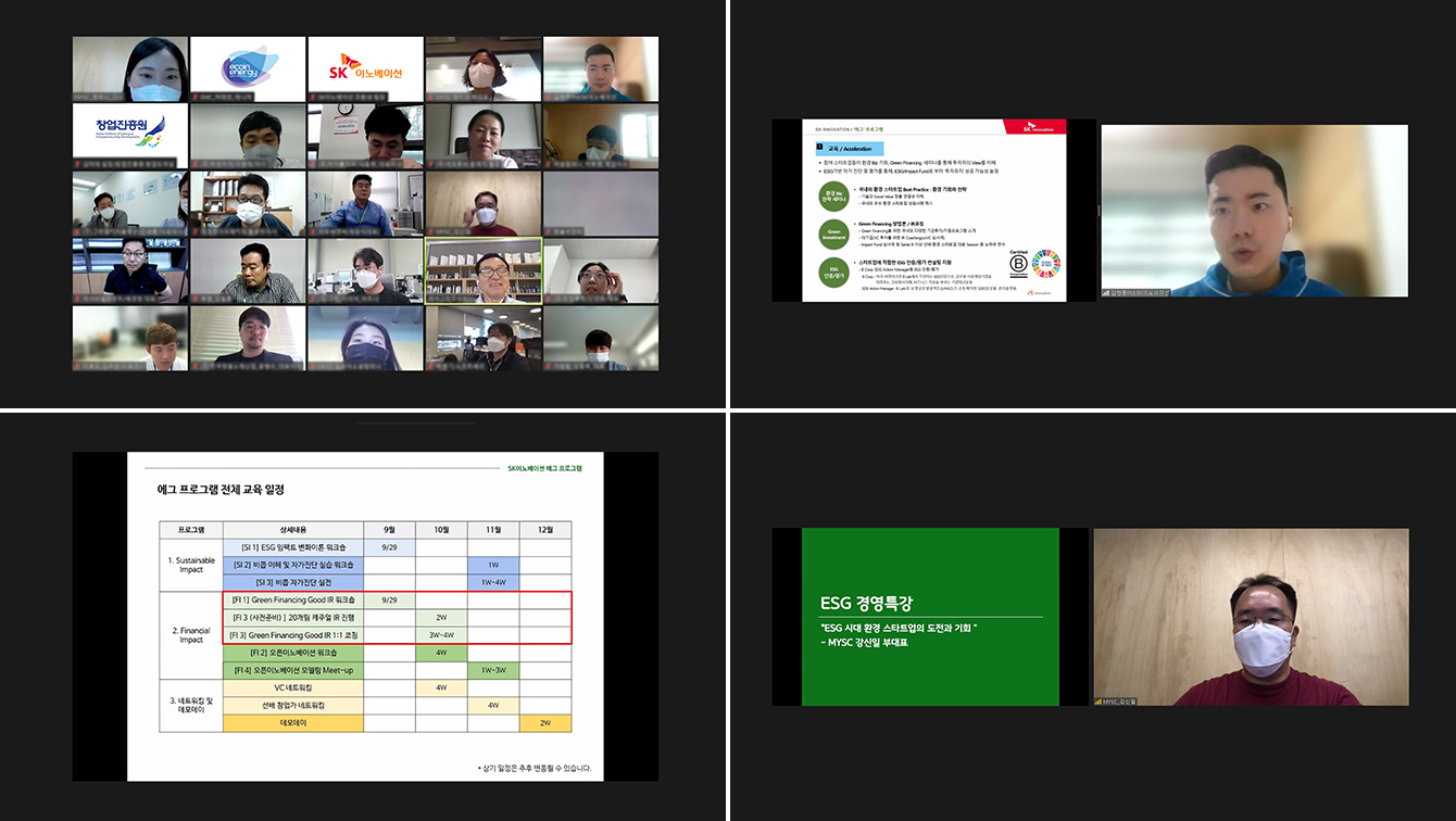 ▲ (상단 좌측) 9월 13일, 온라인으로 진행된 ‘에그’ 발대식에 참여한 최종 선발된 20개의 스타트업 관계자, SK이노베이션 관계자 등 행사 관계자 / (상단 우측) SK이노베이션 ESG전략실 김현문 PM이 SK이노베이션과 ‘에그’ 프로그램에 대해 소개하고 있다. / (하단 좌측) ‘에그’ 프로그램 교육 일정 / (하단 우측) 임팩트 펀드 참여기업인 ‘미스크(MYSC)’의 강신일 부대표가 ESG 경영 특강을 진행하고 있다.