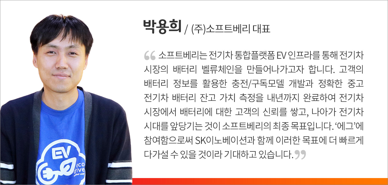 9월 13일 열린 ‘에그’ 발대식은 코로나19 상황을 감안해 온라인으로 진행됐다. 발대식에는 외부 심사위원단을 통해 사업성, 혁신성, SK이노베이션 계열과의 협업 가능성 등의 영역에서 공정하게 선발된 20개의 친환경 스타트업이 참여했다. 이들의 사업분야는 ▲친환경 주유소 플랫폼, ▲폐플라스틱 수거/재활용, ▲전기차배터리 소재/재활용, ▲생산설비 적용 저탄소 기술 등 친환경, 저탄소 분야다.