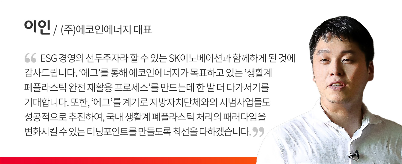 ESG* 경영을 적극 실천하기 위해 SK이노베이션은 지난 2019년부터 2년간 환경부와 협업해 ‘환경분야 소셜 비즈니스 발굴 공모전’을 개최하는 등 친환경 사회적기업의 기술 및 아이디어에 대한 관심과 지원을 이어오고 있다. 더불어 ‘SV2 임팩트 파트너링**’ 프로그램도 함께 운영해 친환경 분야 소셜벤처와의 다양한 형태의 협업을 추진하며 친환경 산업생태계 조성에 기여했다. 이번 ‘에그’ 프로그램은 이러한 친환경 가치 증대를 목적으로 하는 프로그램의 연장 선상인 동시에 정부 기관 및 다양한 기업과의 협업을 통해 한 단계 더 발전된 모습을 하고 있다.