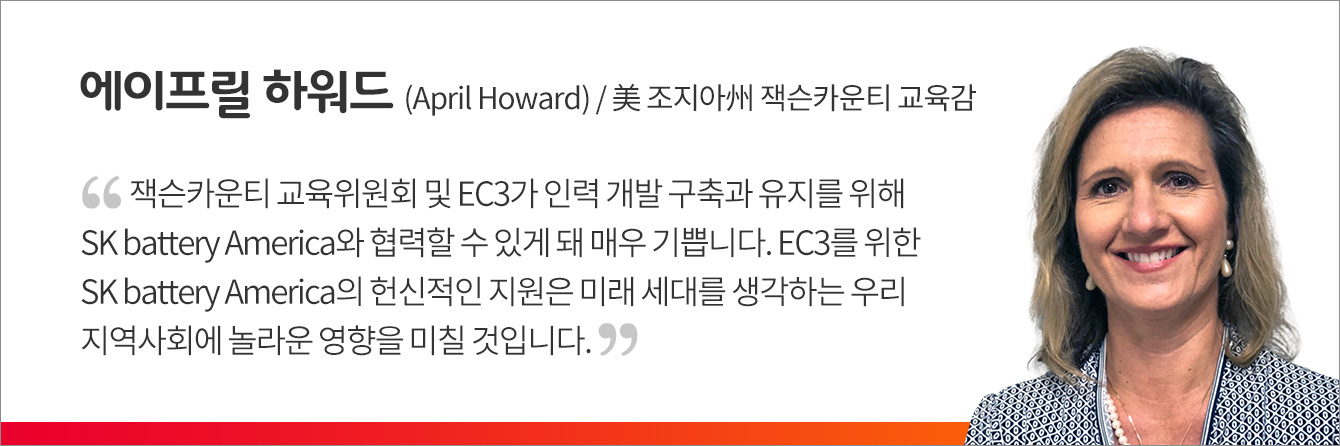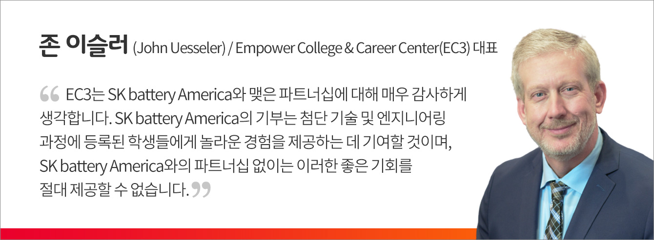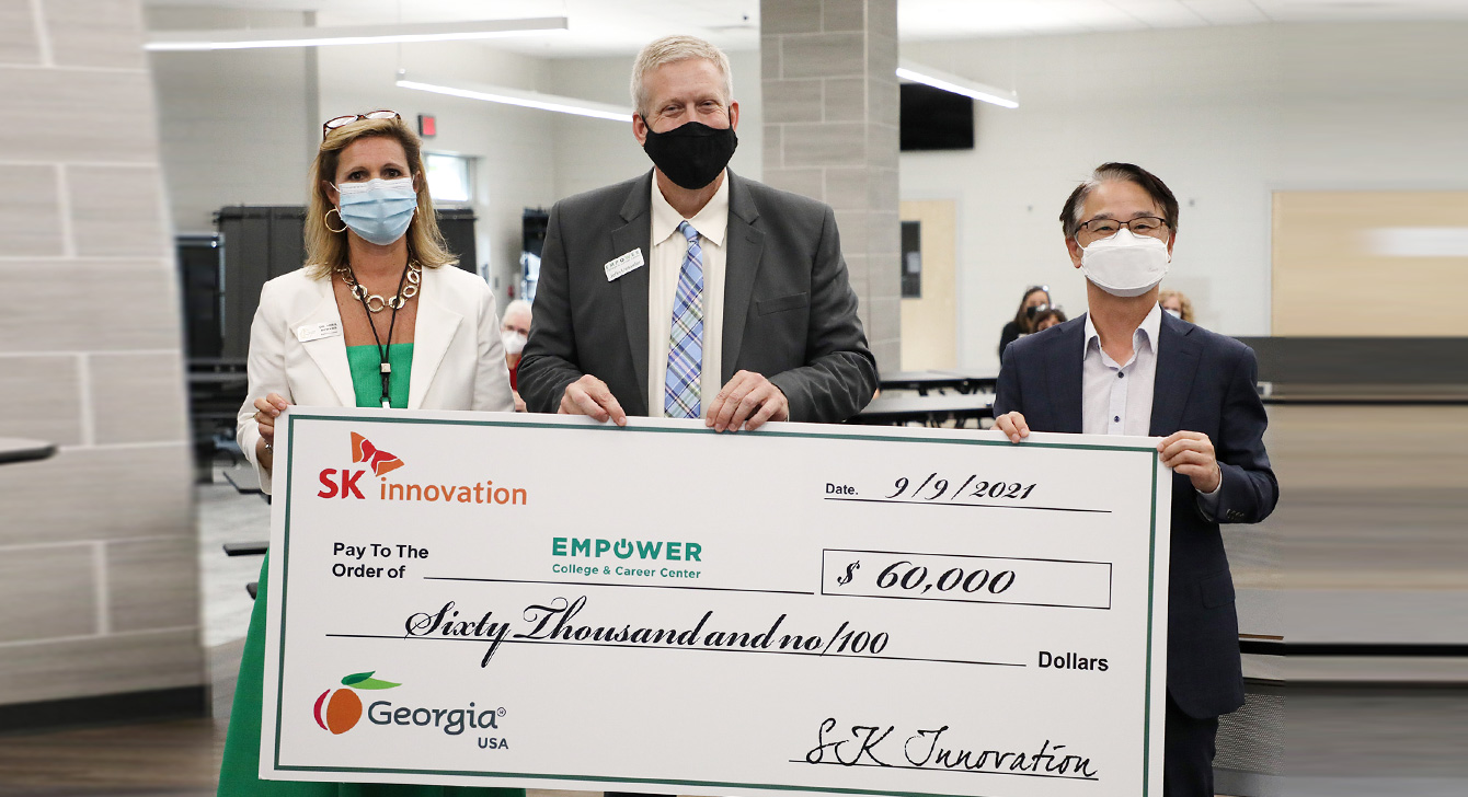 ESG* 경영을 적극 실천하고 있는 SK이노베이션이 전기차 배터리 생산기지가 위치한 美 조지아州 지역사회의 미래 인재 양성을 위해 나섰다. SK이노베이션은 9월 9일(현지 시간), 美 조지아州 잭슨카운티 소재 교육기관인 EC3(Empower College & Career Center, 이하 EC3)에 3년간 총 18만 달러(한화 약 2억 1천만 원)의 기부금을 약정하고 6만 달러(한화 약 7천만 원)를 기부했다. 앞서 SK이노베이션은 지난 2019년과 2020년에도 EC3에 각각 3만 달러(한화 약 3천 5백만 원)를 기부한 바 있다.