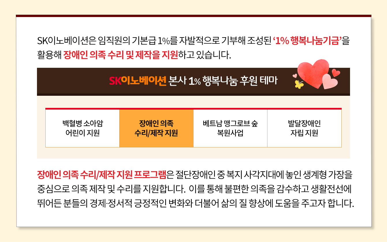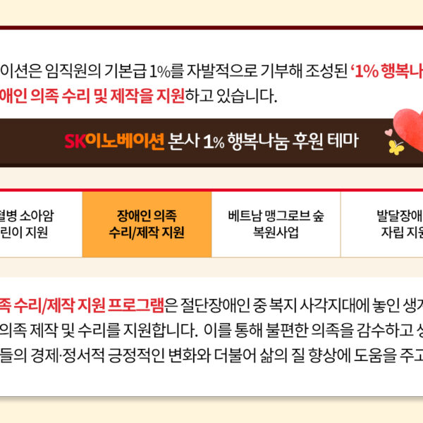 절단장애인을 둘러싸고 있는 이 같은 사회문제를 인식한 SK이노베이션은 장애인 개인의 재기와 가족의 건강한 회복을 지원하기 위해 ‘장애인 의수족 지원사업’을 지속 실시해오고 있으며, 구성원들의 마음을 담은 ‘1% 행복나눔’ 기금을 적극적으로 활용하고 있다.