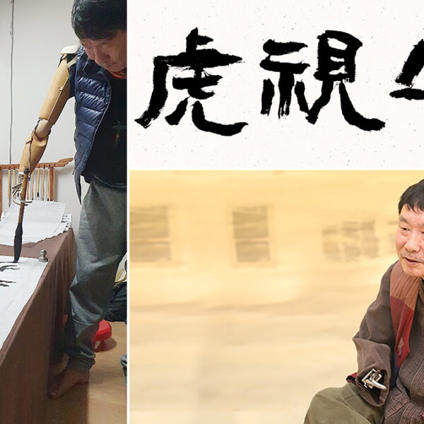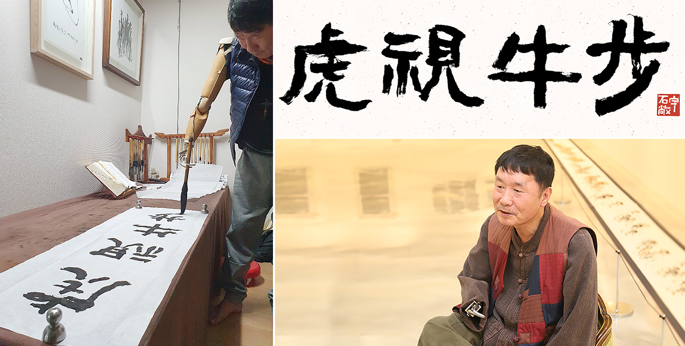 ▲ (좌) 석창우 화백이 SK이노베이션의 ‘1% 행복나눔’ 기금을 통해 지원받은 의수로 ‘호시우보’를 쓰고 있다. / 석창우 화백의 ‘호시우보’ 서예 작품(우측 상단)과 석창우 화백(우측 하단)