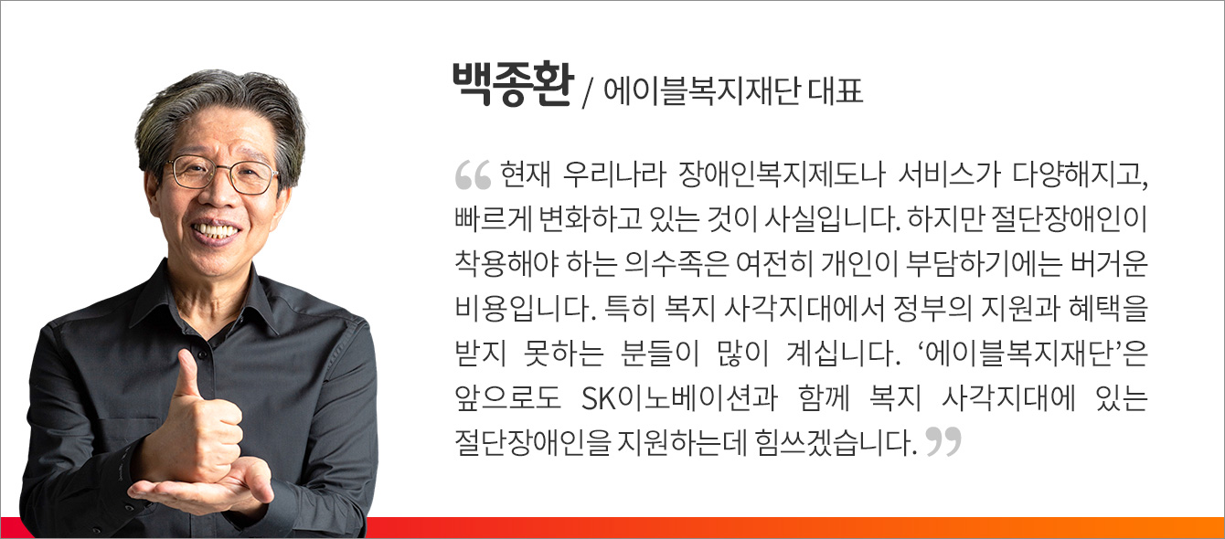 SK이노베이션과 함께 의수족 지원사업을 펼치고 있는 ‘에이블복지재단’ 백종환 대표는 “SK이노베이션 덕분에 절단장애인들과의 지속적인 소통과 희망의 끈을 이어갈 수 있었다”며 감사 인사를 표했다.