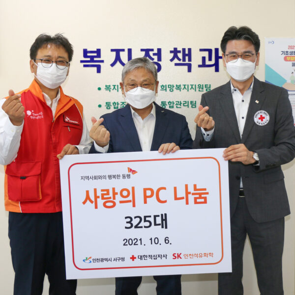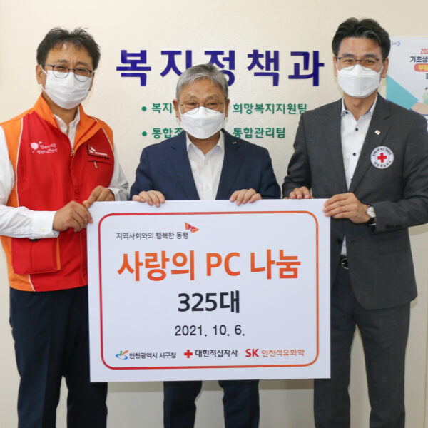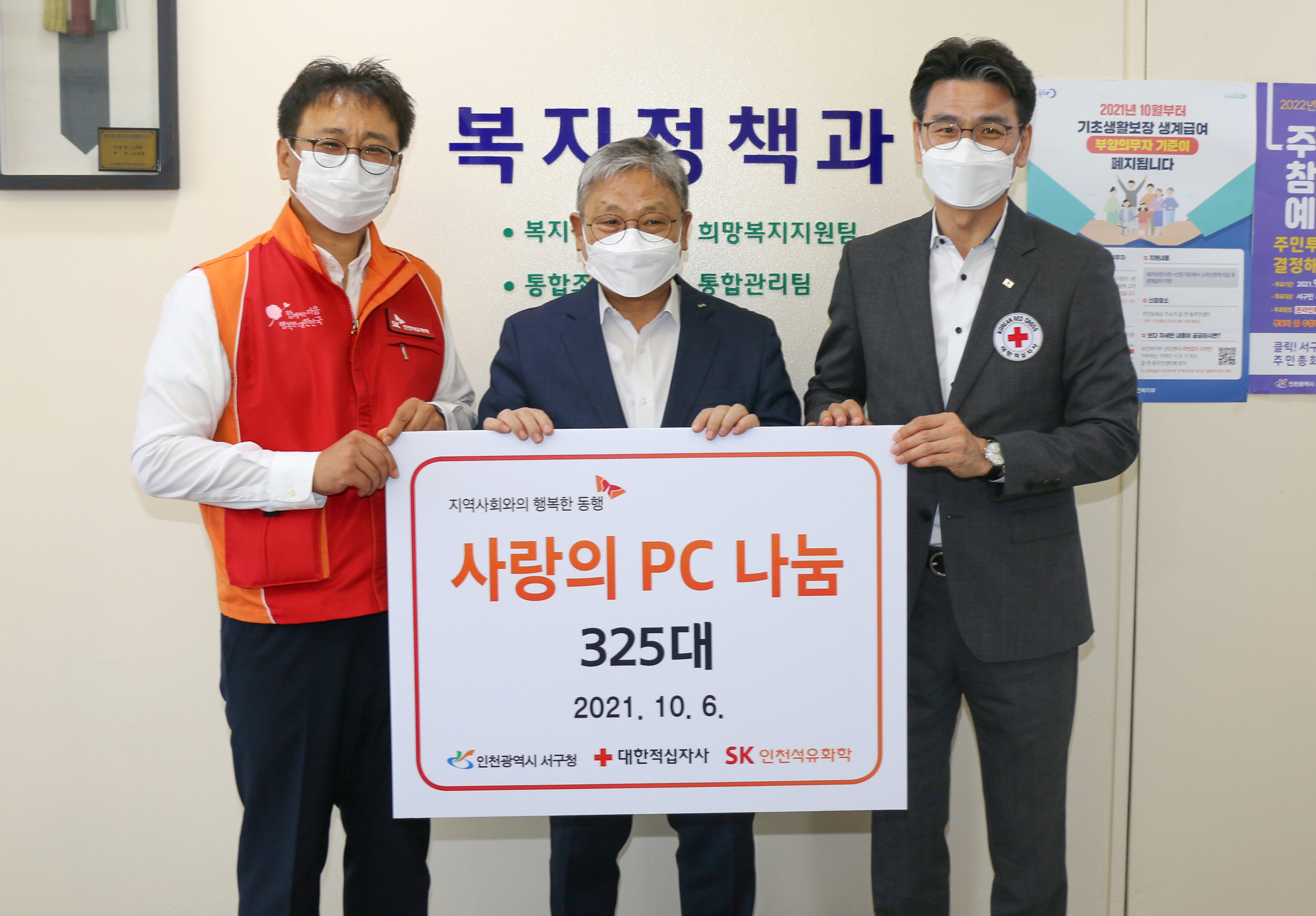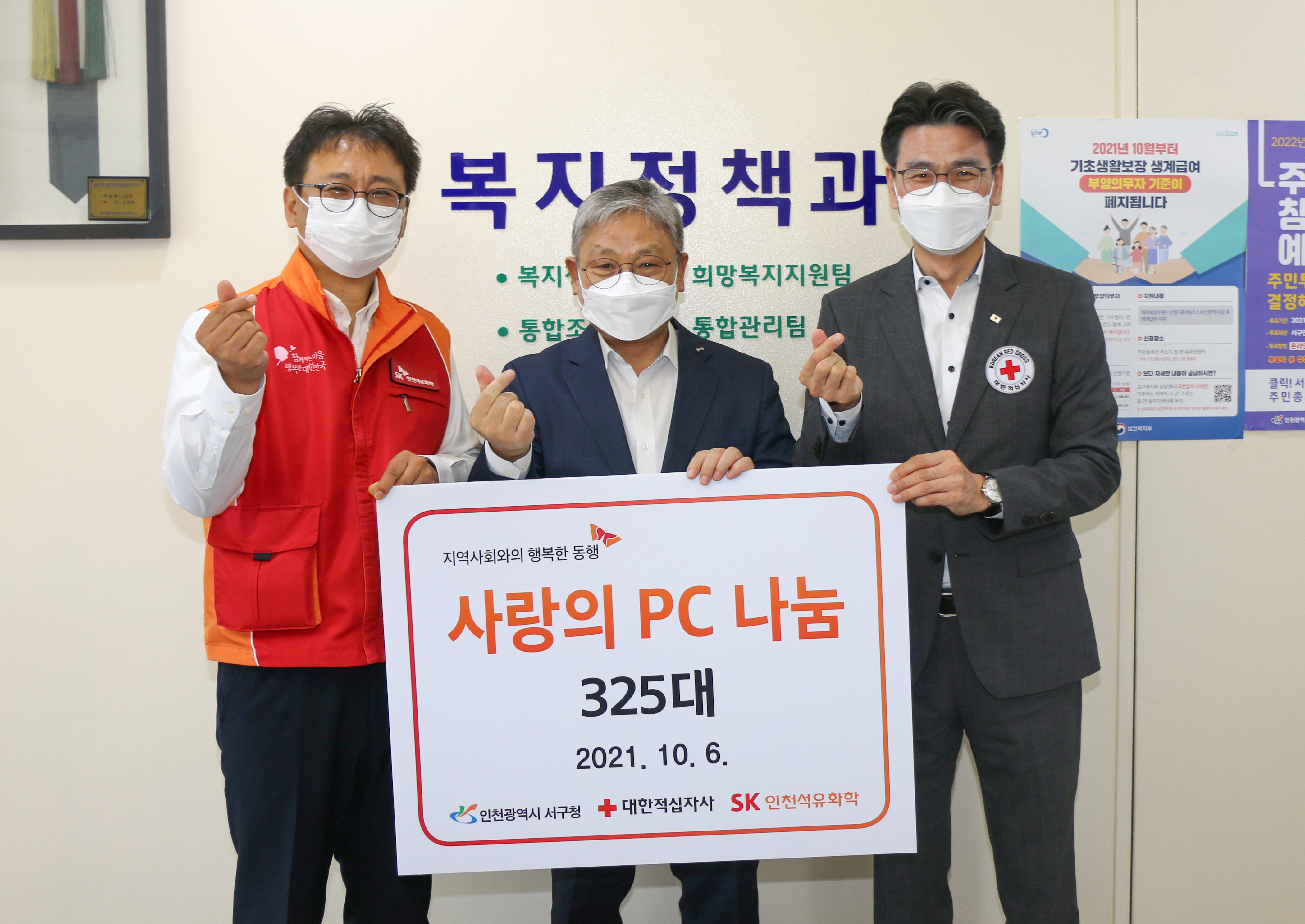 SK인천석유화학은 지난 6일 인천 서구청에서 각 기관 관계자가 참석한 가운데 ‘지역사회와 행복한 동행을 위한 사랑의 PC 전달식’을 개최했다. SK인천석유화학은 대한적십자사 인천광역시지사를 통해 인천 서구지역 저소득층 가정을 위한 노트북 컴퓨터 325대를 기부했다.