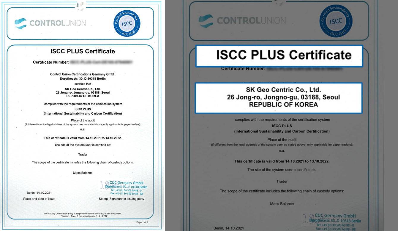 ▲ SK지오센트릭이 받은 ISCC PLUS 인증
