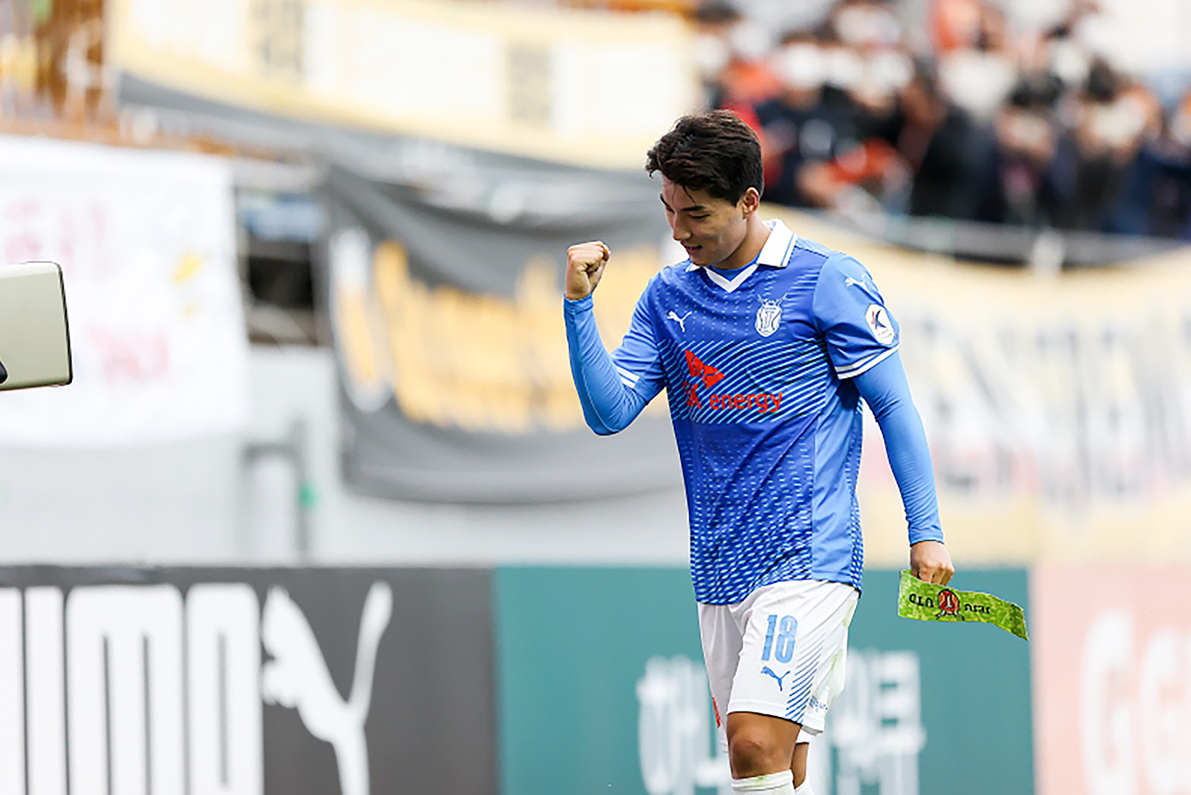 ▲ 지난 10월 24일, 제주월드컵경기장에서 진행된 전북현대모터스와의 경기에서 제주UTD 주민규 선수가 폐플라스틱으로 만든 재생 유니폼인 ‘제주바당’을 입고 골 세레모니를 하고 있다.