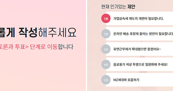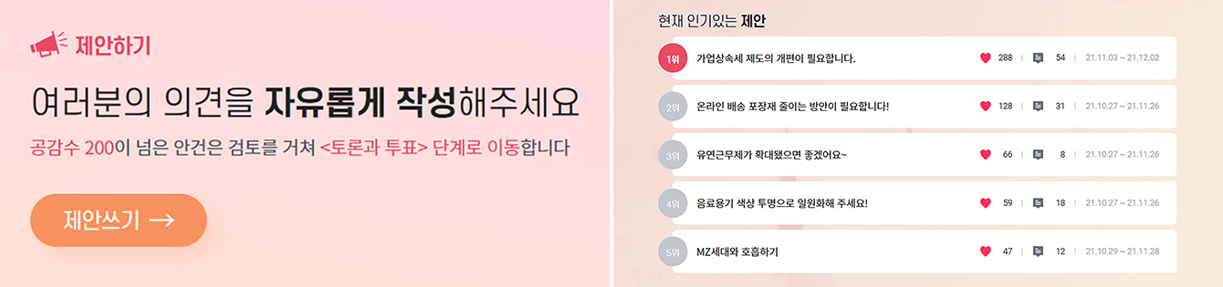 ▲ (좌) ‘대한상의 소통플랫폼’의 1단계 ‘제안하기’ / (우) ‘대한상의 소통플랫폼’에서 확인 가능한 현재 인기있는 제안 – 이미지 출처 : 대한상의 소통플랫폼 공식 홈페이지(http://sotong.korcham.net/)