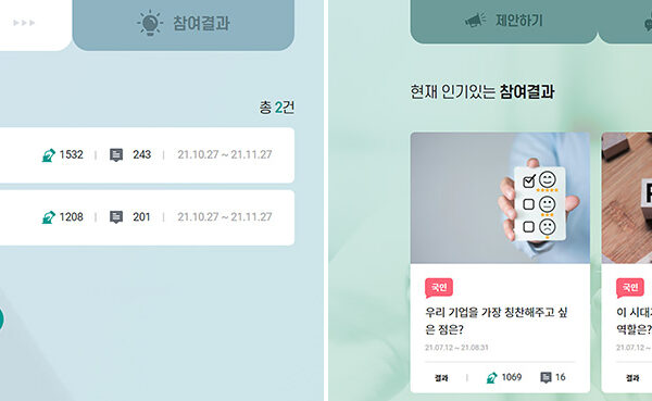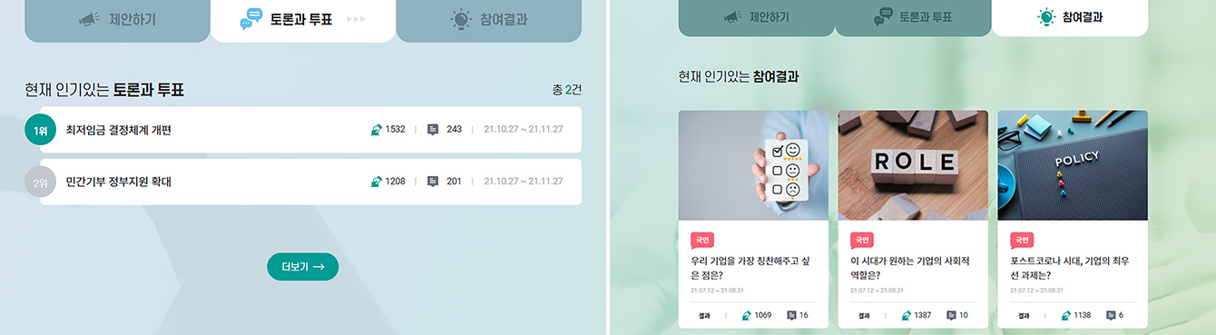 ▲ (좌) ‘대한상의 소통플랫폼’의 2단계 ‘토론과 투표’ / (우) ‘대한상의 소통플랫폼’의 3단계 ‘참여결과’ – 이미지 출처 : 대한상의 소통플랫폼 공식 홈페이지(http://sotong.korcham.net/)