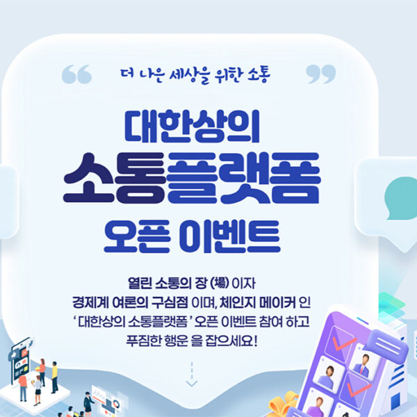 한편, ‘대한상의 소통플랫폼’은 오픈 기념으로 네이밍 공모전을 비롯해 더 많은 사람과 소통하기 위한 로그인 이벤트, 퍼즐게임 등 다양한 이벤트도 진행 중이다.