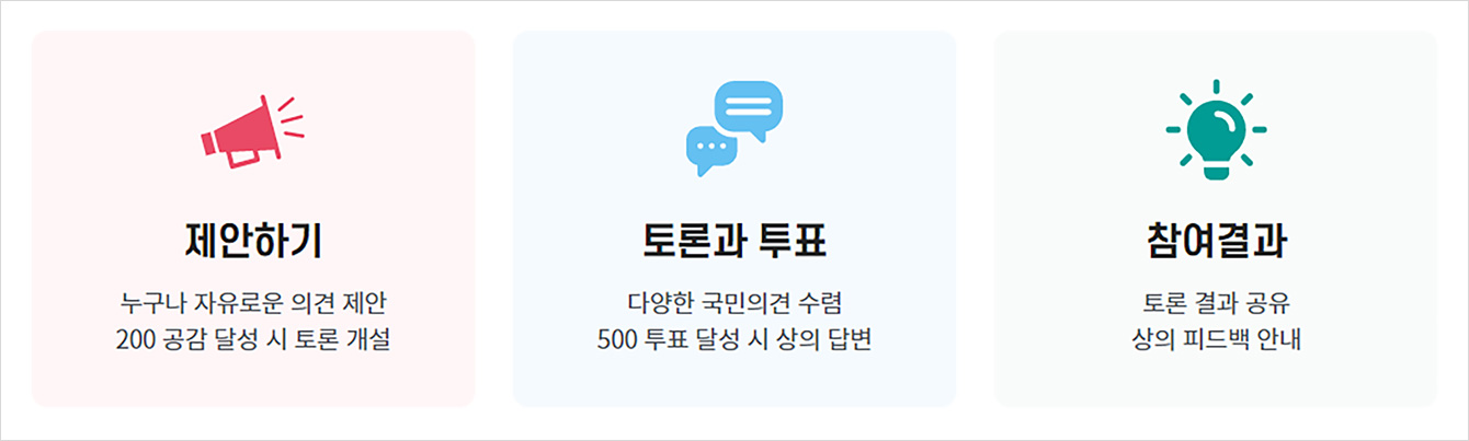 2백 명이 넘는 사람들의 공감을 받은 안건들은 2단계인 ‘토론과 투표’로 넘어간다. 이 중에서 투표수가 5백 개가 넘고 찬성 비율이 50% 이상인 안건은 핵심 아젠다로 선정돼 3단계인 ‘참여결과’에서 대한상의가 해당 안건의 토론/투표 결과를 발표한다.