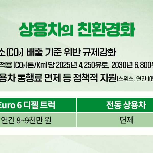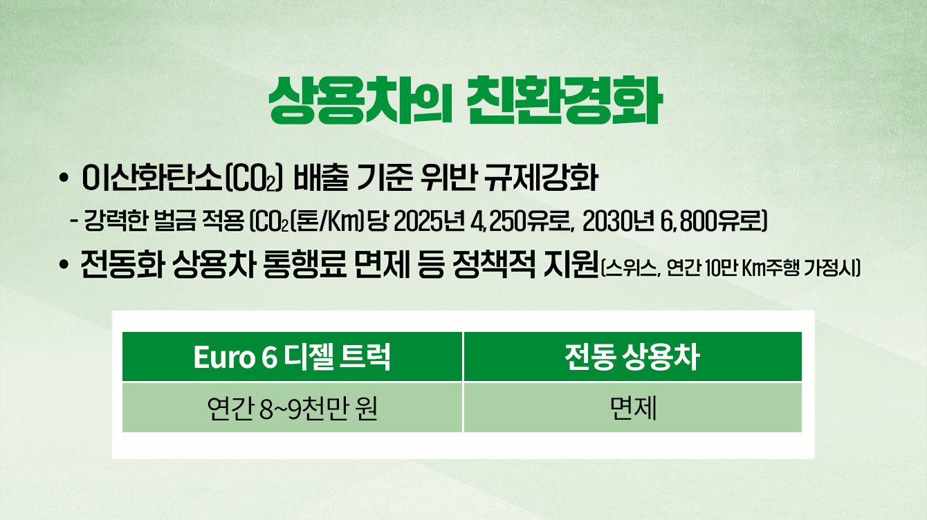 전 세계 차량 중 상용차 비중은 9% 정도 되지만, 온실가스 배출량은 전체의 약 40%를 차지하고 있습니다. 현재 EU(유럽연합)를 시작으로 배출가스 규제가 강화되고, 친환경차 지원 정책 등이 확대됨으로써 상용차의 친환경화가 급속하게 진행 중인 상황인데요.