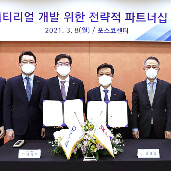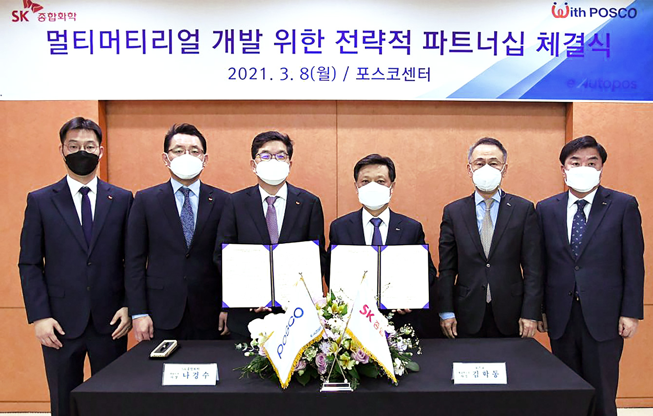 ▲ 지난 3월 8일, SK지오센트릭(당시 SK종합화학)과 포스코가 ‘전기차용 철강-플라스틱 복합소재 공동 개발’을 위한 MOU를 체결했다. (왼쪽에서 세 번째부터 SK지오센트릭 나경수 사장, 포스코 김학동 사장)