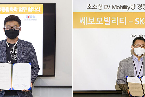 ▲ (좌) 지난 6월 11일, SK지오센트릭(당시 SK종합화학)과 한국스마트이모빌리티협회가 초소형 전기차 핵심부품 경량화를 위한 신소재 개발 목적의 MOU를 체결했다. (왼쪽부터 SK지오센트릭 배성찬 Automotive 사업부장, 한국스마트이모빌리티협회 하일정 사무국장) / (우) 올해 9월 3일, SK지오센트릭과 쎄보모빌리티가 초소형 전기차용 소재 개발을 위한 MOU를 체결했다. (왼쪽부터 SK지오센트릭 배성찬 Automotive 사업부장, 쎄보모빌리티 곽용선 전무)