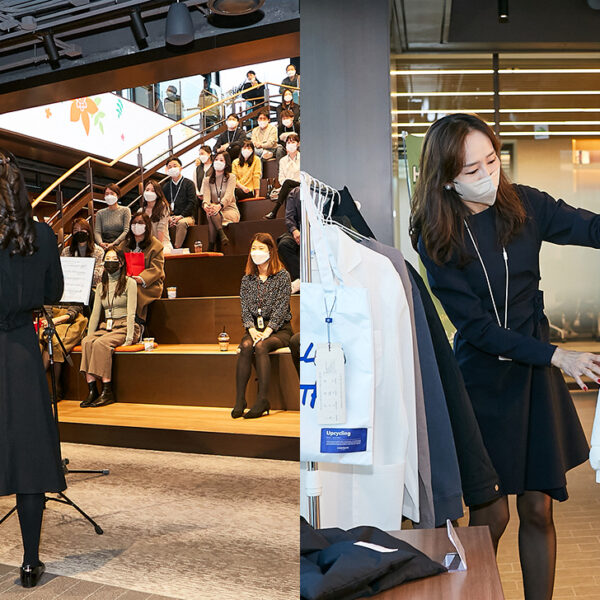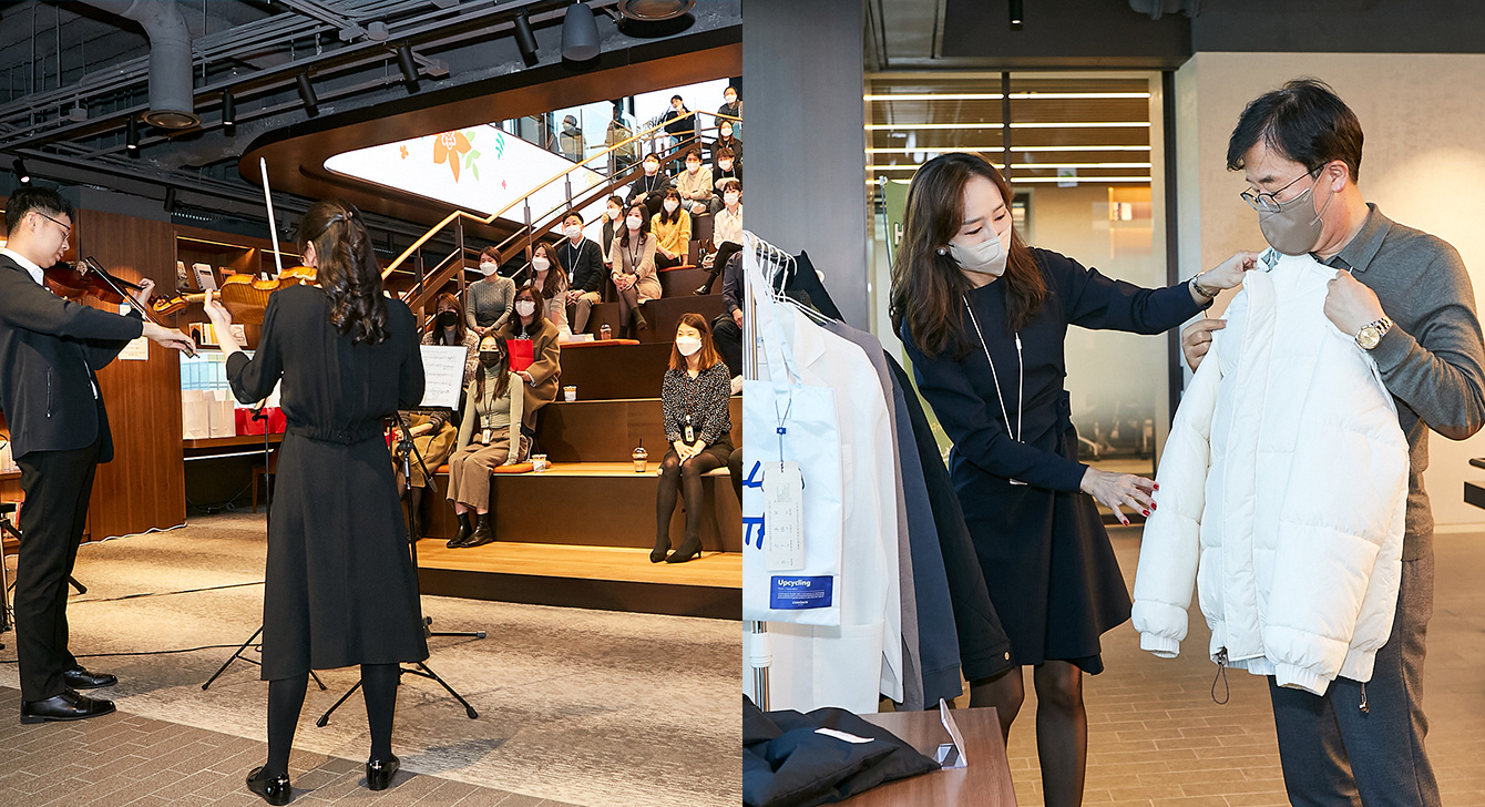 ▲ (좌) 11월 25일, SK서린사옥(서울 종로구 소재)에서 열린 SK이노베이션의 ‘힐링플러스 스페이스(Healing+Space)’ 행사에서 제5회 GMF 대상 수상 팀 ‘비바체 앙상블’이 공연을 하고 있다. / (우) ‘힐링플러스 스페이스’ 행사의 일환으로 열린 폐플라스틱 업사이클링 제품 전시회 ‘플라스틱 트랜스포메이션’에서 SK루브리컨츠 차규탁 사장(오른쪽)이 구성원과 함께 업사이클링 의류를 둘러보고 있다.