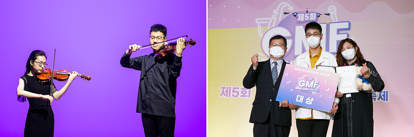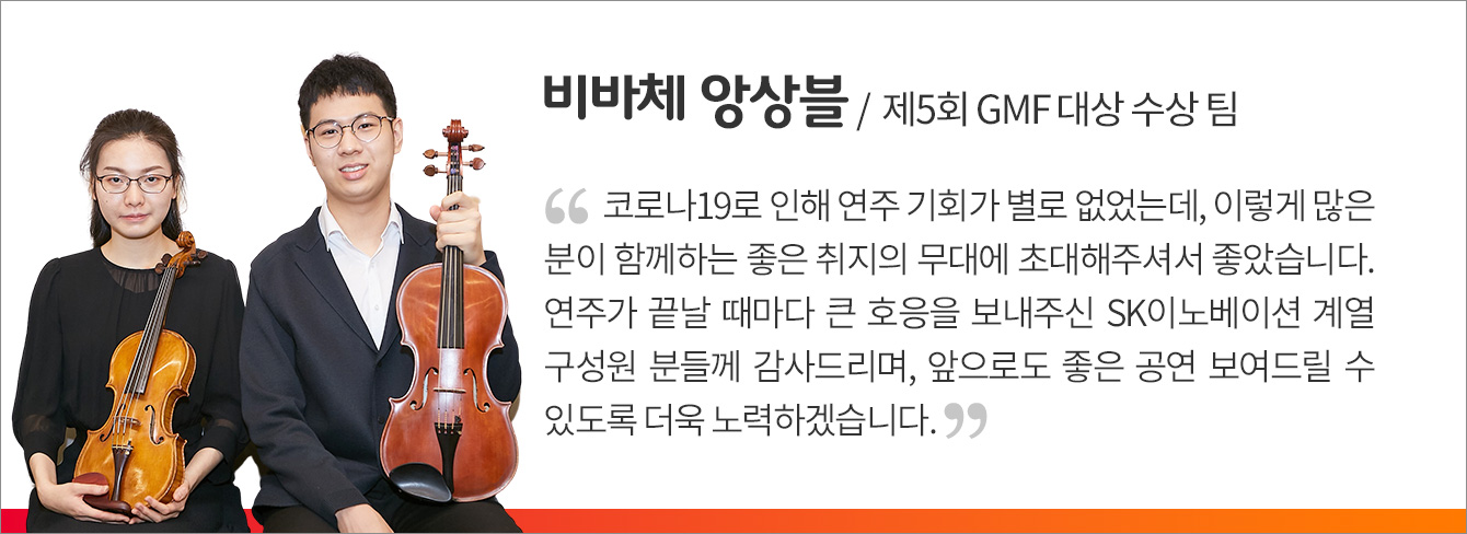 제5회 GMF 대상 수상팀인 ‘비바체 앙상블’은 동갑내기 친구로 구성됐으며, 그간 다양한 연주 대회에서 수상한 실력파 듀오다. 하지만 최근 코로나19로 인해 공연 활동이 줄어들어 아쉬워하던 중 GMF에 참가해 훌륭한 연주 실력으로 많은 이의 응원을 받으며 대상을 수상했다.