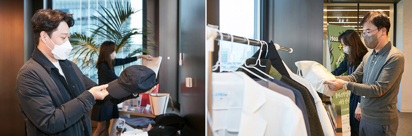 ▲ (좌) ‘힐링플러스 스페이스’ 행사의 일환인 폐플라스틱 업사이클링 제품 전시회 ‘플라스틱 트랜스포메이션’에서 구성원들이 사회적기업 ‘몽세누’의 폐플라스틱 업사이클링 모자를 보고 있다. / (우) SK루브리컨츠 차규탁 사장(오른쪽)이 사내 구성원 대상 ‘플라스틱 업사이클링 아이디어 공모전’ 당선작을 기반으로 제작된 사회적기업 ‘라잇루트’의 에코백을 보고 있다.
