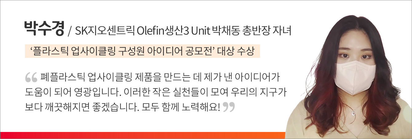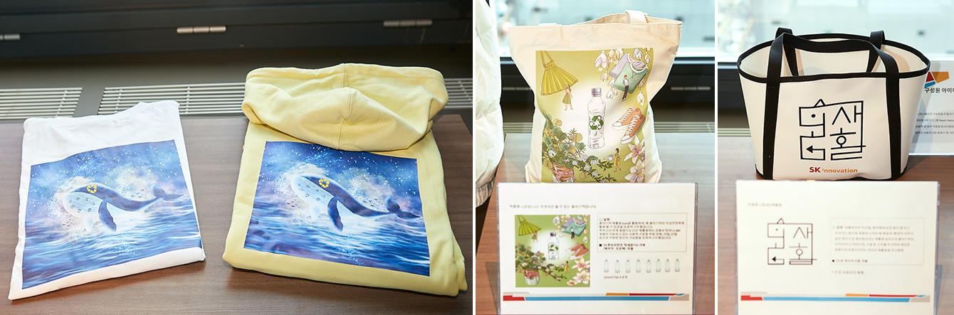 공모전 대상 수상작은 SK지오센트릭 Olefin생산3 Unit 박채동 총반장의 자녀인 박수경氏의 ‘돌고래야 미안해 우리가 지켜줄게’로, 고래를 아프게 하는 해양 쓰레기를 재활용하고 환경오염을 예방하자는 뜻을 담았다. 이 작품은 사회적기업 ‘라잇루트’와 ‘몽세누’에서 폐페트(PET)병 11개를 사용해 각각 맨투맨과 후드티로 제품화했다.