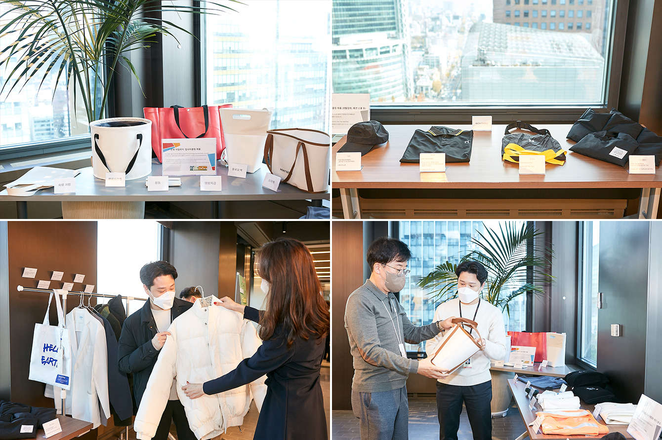 ▲ (상단 좌측) 사회적기업들이 SK지오센트릭의 폐사일리지 업사이클링 원단을 활용해 제작한 가방들 / (상단 우측) 사회적기업 ‘몽세누’, ‘라잇루트’, ‘우시산’의 다양한 업사이클링 제품들 / (하단) SK루브리컨츠 차규탁(우측 왼쪽)과 구성원들이 사회적기업 제품들을 둘러보고 있다.