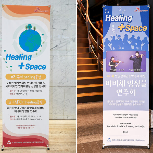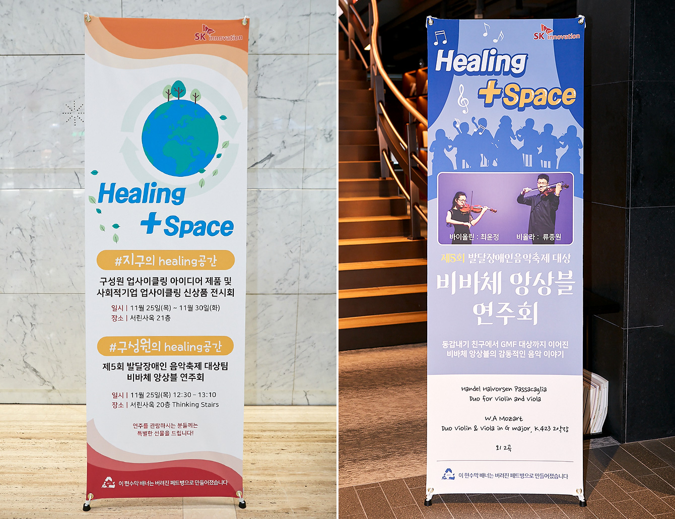 ▲ 폐페트병을 업사이클링해 제작한 ‘힐링플러스 스페이스’ 행사의 홍보 배너가 SK서린사옥 로비와 문화공간 씽킹스테어(Thinking stair)에 배치돼 있다.