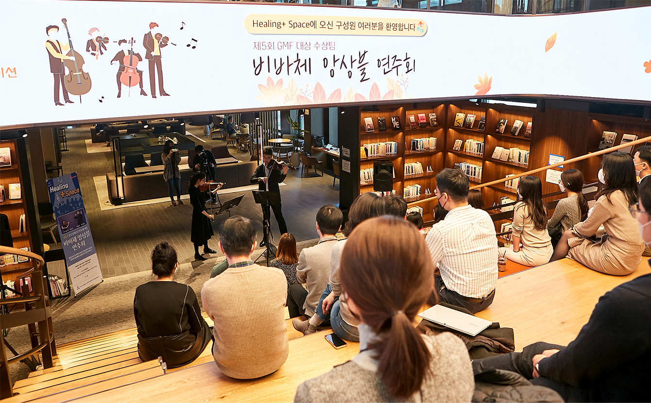 ▲ 11월 25일, SK서린사옥(서울 종로구 소재)에서 열린 ‘힐링플러스 스페이스’ 행사에서 SK이노베이션 계열 구성원들이 제5회 GMF 대상 수상팀인 ‘비바체 앙상블’의 공연을 보고 있다.