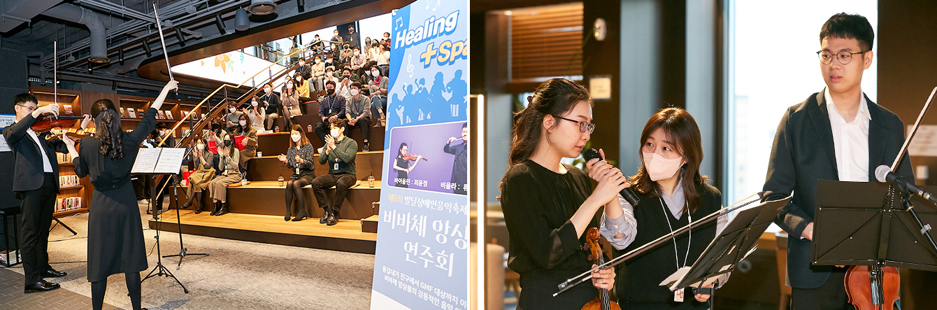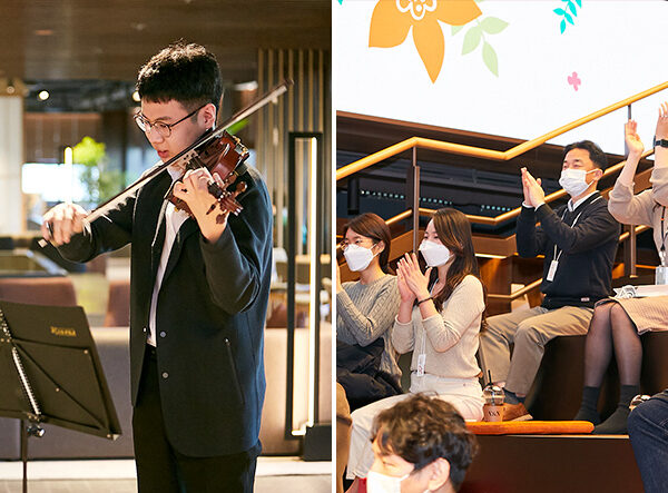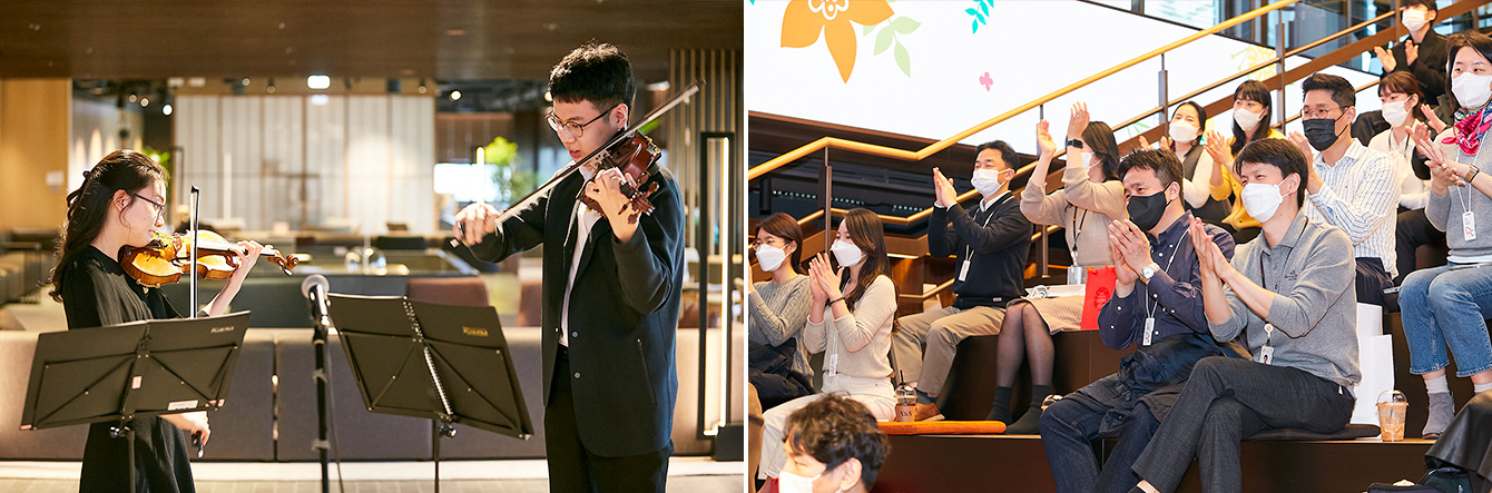 ▲ (좌) ‘힐링플러스 스페이스’ 행사에서 제5회 GMF 대상 수상팀인 ‘비바체 앙상블’이 ‘오버 더 레인보우’를 연주하고 있다. / (우) SK이노베이션 계열 구성원들이 ‘비바체 앙상블’의 연주를 감상하고 있다.