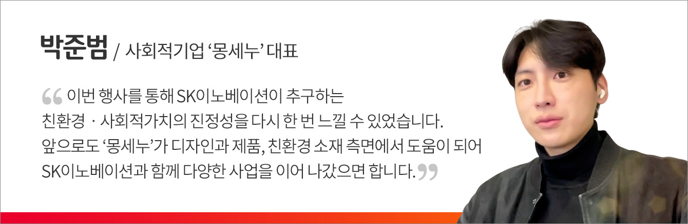 특히 SK이노베이션이 사내 구성원 및 그 가족을 대상으로 진행한 ‘플라스틱 업사이클링 아이디어 공모전(이하 공모전)’을 통해 선정된 총 10개의 수상작 중, 일부 아이디어를 SK이노베이션이 육성 지원하는 사회적기업 ‘몽세누’, ‘라잇루트’가 제품화해 이번 전시에 선보였다.
