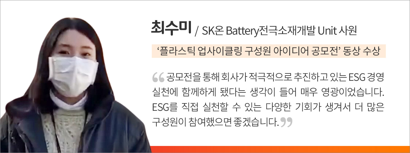 동상 수상작인 SK온 Battery전극소재개발 Unit 최수미 사원의 ‘새활용’ 로고는 플라스틱에 새로운 가치를 더해 새로운 제품으로 탄생시키자는 의미를 담았다. 이 작품은 사회적기업 ‘몽세누’가 SK이노베이션의 자회사 SK지오센트릭의 곤포 폐사일리지(Silage) 활용 원단으로 만든 가방에 적용됐다.