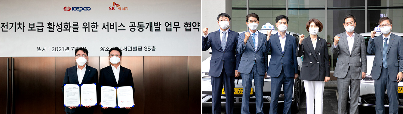 ▲(좌) 지난 7월, 서울 종로구 소재 SK서린빌딩에서 한국전력공사와 SK에너지가 국내 전기차 보급 활성화를 위한 서비스 공동개발 업무협약을 체결했다. (왼쪽부터 한국전력 이종환 사업총괄부사장, SK에너지 오종훈 P&M CIC 대표) / (우) 올해 8월, 서울 양재동 소재 더케이호텔에서 열린 ‘무공해택시 보급 확대 위한 MOU’ 체결식에 참석한 행사 관계자들이 기념사진을 촬영하고 있다. (왼쪽에서 세 번째부터 유연식 서울시 기후환경본부장, 한정애 환경부 장관, 오른쪽에서 첫 번째가 SK에너지 강동수 Solution & Platform추진단 본부장)