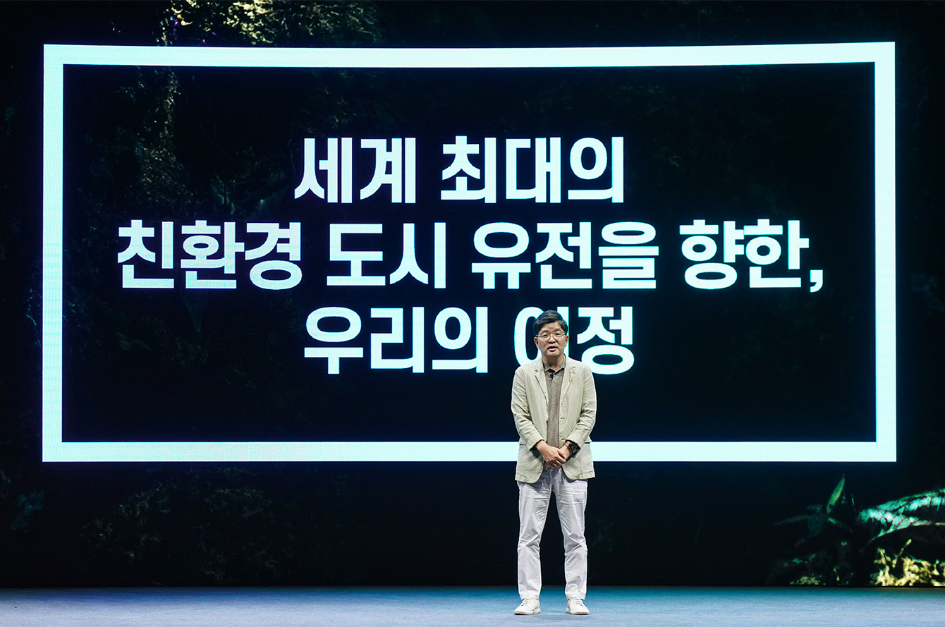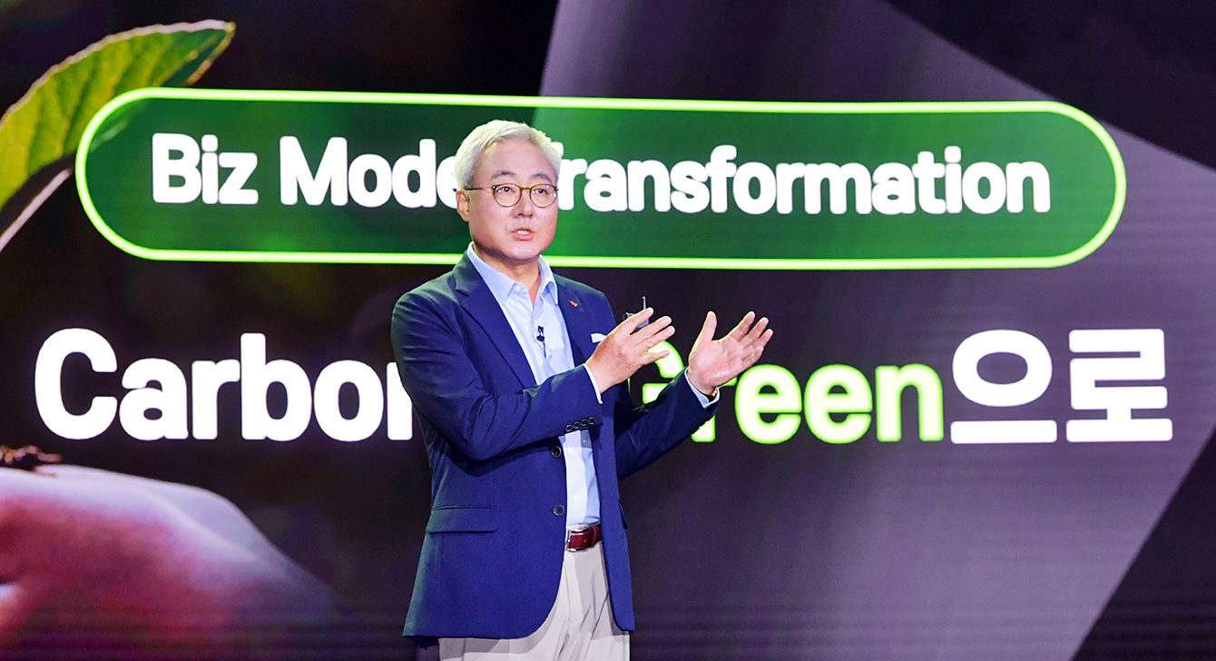 ▲ SK이노베이션 김준 총괄사장이 지난 7월에 열린 ‘스토리 데이(Story Day)’에서 회사의 핵심 전략인 ‘탄소 사업에서 그린 중심 사업으로(Carbon to Green)’를 발표하고 있다.