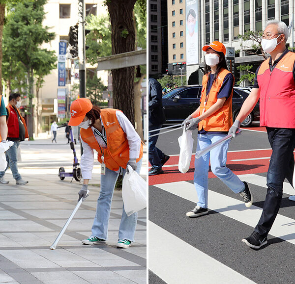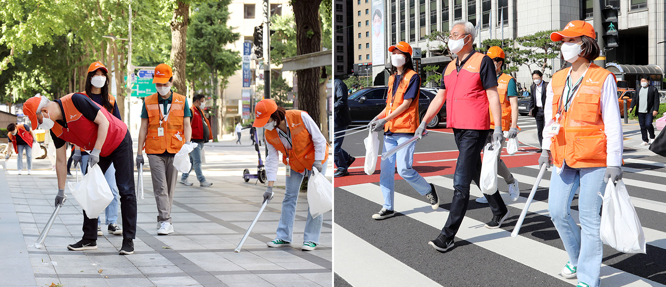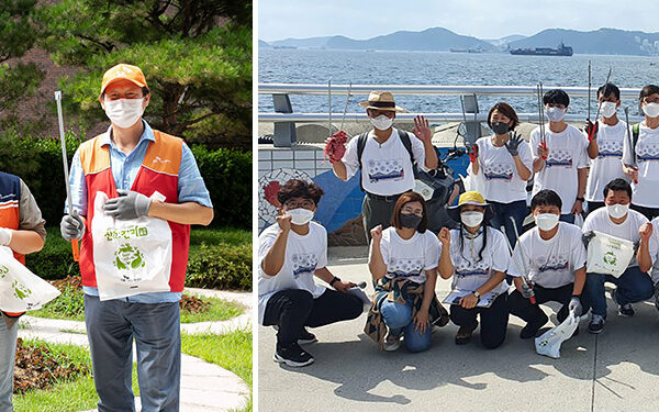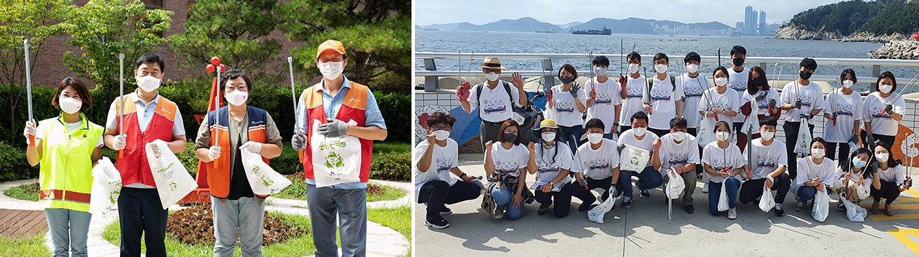 ▲ (좌) 지난 8월, 서울 종로구 광화문 일대에서 (왼쪽부터) 사회복지공동모금회 김경희 사회공헌본부장, SK이노베이션 이성훈 노동조합위원장, 한국중앙자원봉사센터 권미영 센터장, SK이노베이션 임수길 밸류크리에이션센터장이 산해진미 플로깅 범국민 캠페인을 위한 업무협약(MOU)을 체결 후 플로깅 봉사활동에 참여했다. / (우) 지난 9월, SK이노베이션의 자회사 SK지오센트릭은 ‘더 착한 자원순환 사업’ 협약 기관인 부산항만공사와 함께 부산지역 해안도로를 중심으로 산해진미 플로깅을 진행했다. – 위 봉사활동은 코로나19 방역지침을 철저히 준수하며 진행됐음