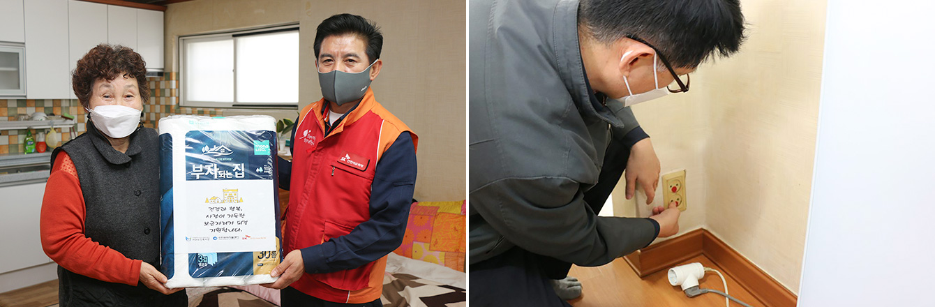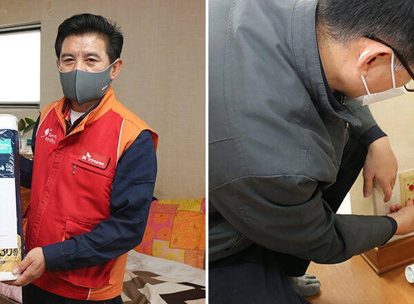 ▲ (좌) SK인천석유화학이 사랑의 집수리 사업 100호를 맞아 인천 서구지역 수혜 가정을 방문해 집들이 선물을 전달했다. / (우) SK인천석유화학 구성원이 사랑의 집수리 사업 100호를 맞아 수혜 가정을 방문해 화재 방지 스티커를 부착하고 있다.